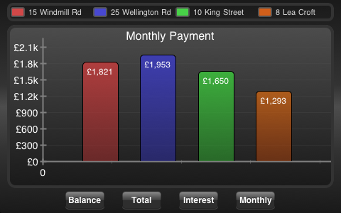 A: Simply choose up to 4 loans, flip the iPhone on its side, and visualise the figures side by side in a colour coded chart.