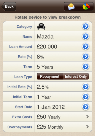 To get started with this app you need to enter a few basic details about your loan. Once entered, the loan is automatically saved and you can view an analysis. Simply flip the iPhone on to its side and you are presented with a breakdown of the monthly payments. Press the chart icon to 'visualise' the payments throughout the term of the loan.